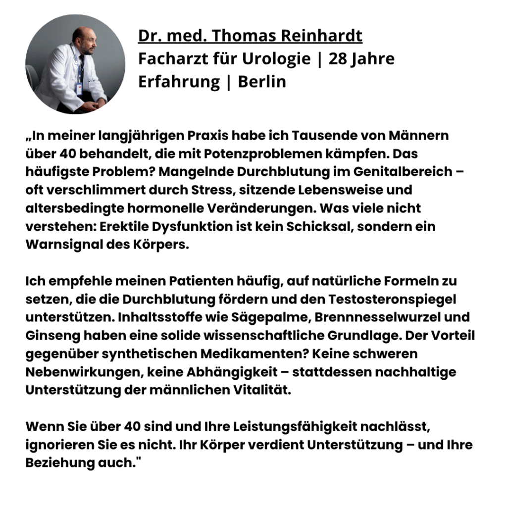 Über 6.892 Männer in Deutschland haben in unserer Formel eine vertrauenswürdige Unterstützung gefunden, um ihre Gesundheit und männliche Kraft zurückzugewinnen.